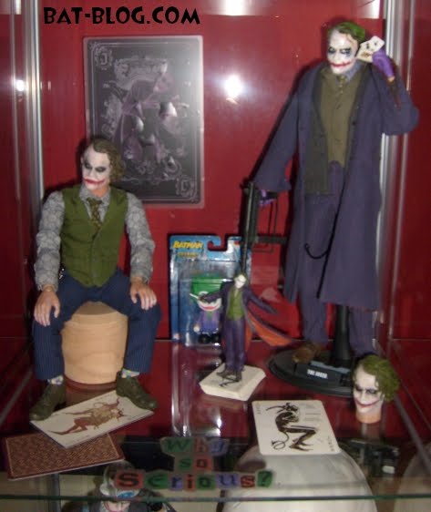 Every now & then Bat-Blog Fans ( at least the ones that are smart & cool ) send us photos of their BATMAN TOY Collections & we always love to see them because it's always great to see other people's stuff. Here's some pics sent to us by our friend Jason & he's done a great job at displaying his toys & memorabilia. Now to be honest, he sent more pictures than this, but we have been having major issues with our email program so I grabbed all the pics I could get. But there's enough here to enjoy & there's plenty of eye candy too! Jason has a whole room dedicated to Batman with a lot of framed art & display cases. Basically, we're showing one wall with a cool BATMAN Comic Book Cover Puzzle that has been framed & a few shelves of Joker Toys, mostly from The Dark Knight movie but also a nice mix of other versions. The puzzle is a recent piece from none other than The Pottery Barn. Yes, a couple of years ago they created a few Batman Products ( mostly bedding ) & if you're a long time reader of the Bat-Blog you might remember our post about it. At the time I really wanted this puzzle, still do, ha! The other toys include a very cool Bat-Belt Replica, a Harley Quinn Barbie, a Joker PEZ Candy Dispenser, a few Action Figures, & some awesome HOT TOYS Figures! ( Thanks for sending these pics in Jason, you have got some extremely cool stuff here & I love the display action. )