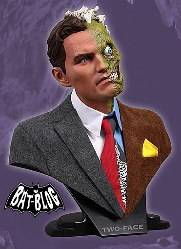 At the end of next month, March 30, 2011, DC Direct will release a brand-new BATMAN Statue of TWO-FACE as a 1:2 Scale BUST. It was sculpted by ANDY BERGHOLTZ. The man once known as District Attorney Harvey Dent appears here in his classic comic-book style, dressed in his trademark dual-fabric suit, shirt and tie, which are finely tailored over his cold-cast porcelain body. It will be mounted on a museum-style, pedestal display base, this mixed-media piece measures approximately 13" tall, includes a 4-color Certificate of Authenticity and is packaged in a 4-color box. Limited edition of 500 pieces & will have a Retail price around $ 295.00 but can be found ON SALE at certain websites.